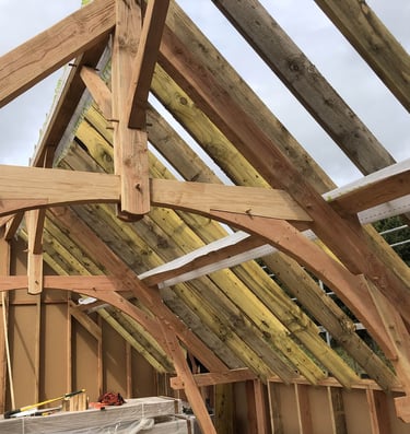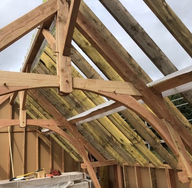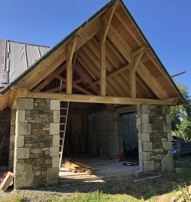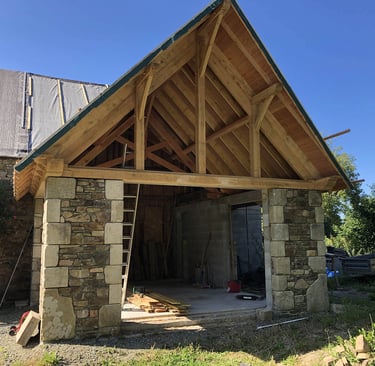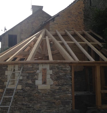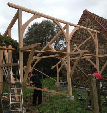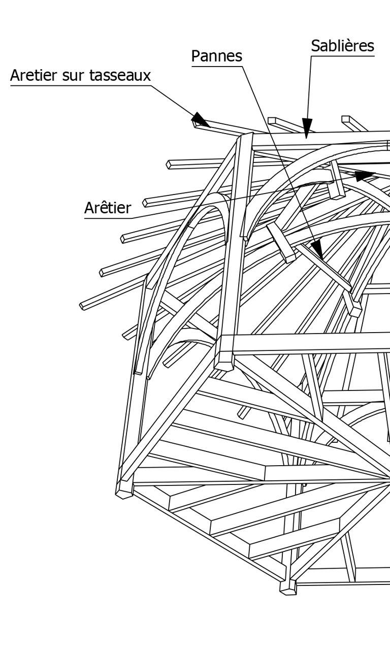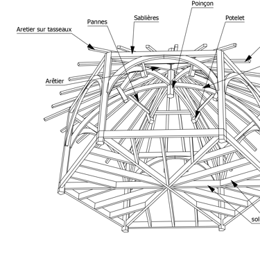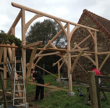 La charpente est taillée et assemblée à blanc en atelier puis levée sur place grâce à des techniques d’emboîtement traditionnelles.